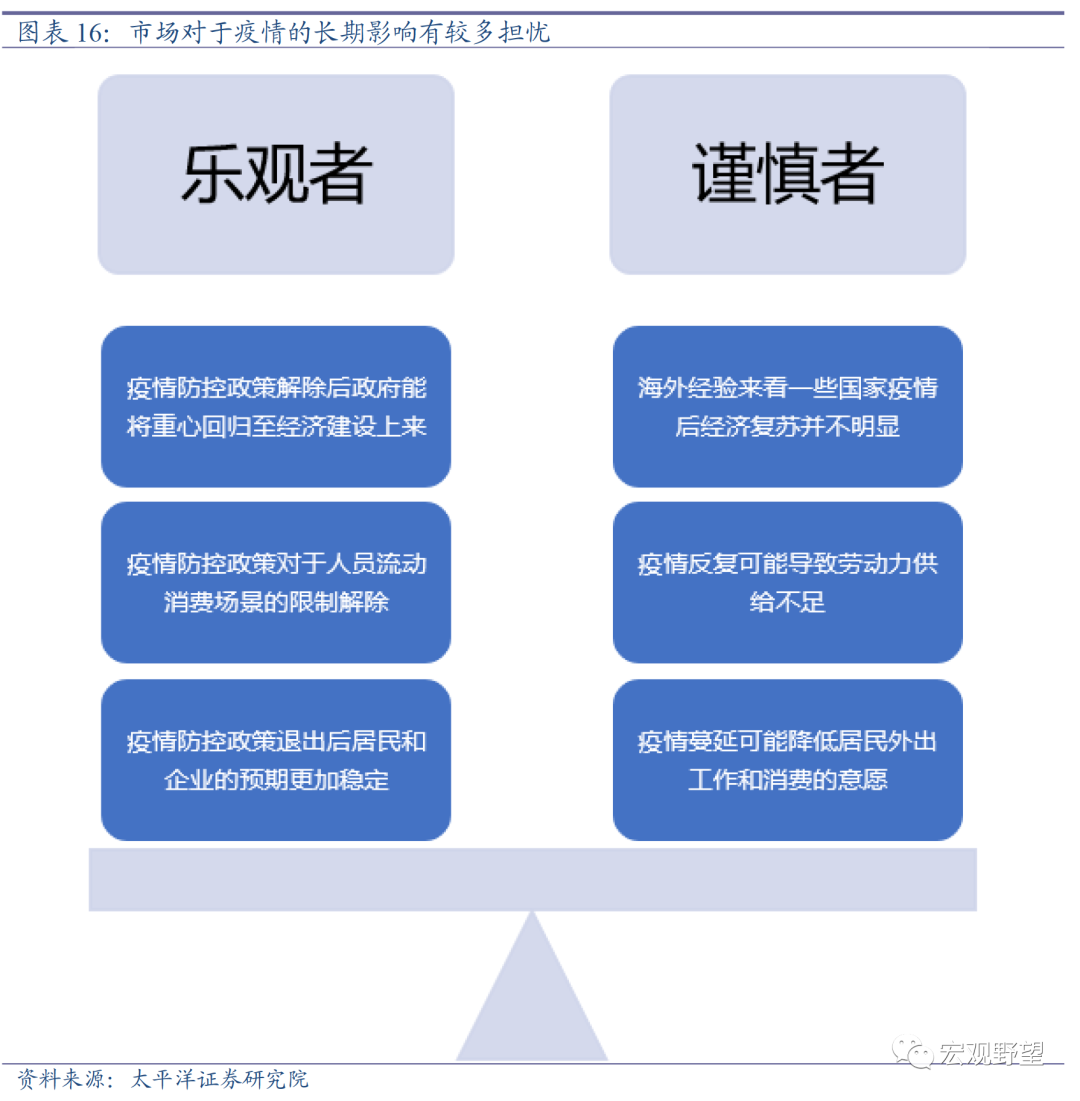 从疫后经济复苏的角度来看,我们对于经济前景相对乐观。目前市场上对于疫情对未来经济影响的分歧较大。乐观者,疫情防控政策解除之后,政府有更大的财力和精力来管理经济工作;居民和企业的对于此前时常封城的不确定性的担忧能够消除,有助于预期的稳定;而且疫情防控政策对于人员流动和消费场景的限制也会相应解除。这些因素都有助于释放经济活力。但悲观者认为,疫情的“疤痕效应”可能仍然会比较明显,包括疫情蔓延对于居民外出工作和消费意愿的影响、疫情反复对劳动力供给形成的冲击等。而且很重要的是,从很多海外国家的经验来看,似乎疫情防控政策放开后经济复苏的趋势也并不明显,反而很多指标是下滑的。这些因素导致市场对疫后经济前景产生较多的担忧。当然,影响未来经济复苏的还有其它很多因素,比如房地产周期的下行、居民疫情期间的收入下滑等,但这些并非疫情的直接影响,我们在本小节中先讨论疫情对经济的直接影响。
