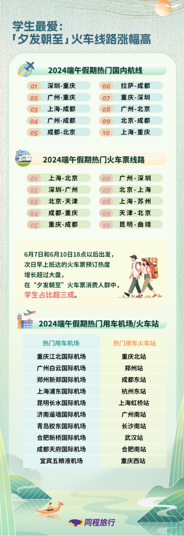 端午假期,为了高效利用3天假期,不少学生群体选择乘坐“夕发朝至”的火车,晚上赶路,白天游玩。同程旅行数据显示,6月7日和6月10日18点以后出发,次日早上抵达的火车票预订热度增长超过大盘,在“夕发朝至”火车票消费人群中,学生占比超三成。火车票热门线路则主要集中在京沪、广深、成渝、京津等核心城市之间。此外,节前山东前往拉萨的“铁腚大巴”走红网络,不少年轻游客也挖掘了更多“铁腚线路”,在端午假期出门体验。