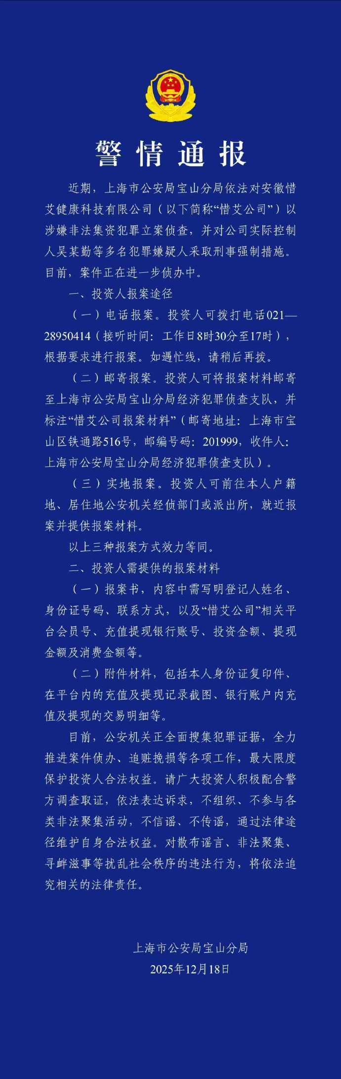 12月18日,上海市公安局宝山分局发布警情通报。近期,上海市公安局宝山分局依法对安徽惜艾健康科技有限公司(以下简称“惜艾公司”)以涉嫌非法集资犯罪立案侦查,并对公司实际控制人吴某勤等多名犯罪嫌疑人采取刑事强制措施。目前,案件正在进一步侦办中。