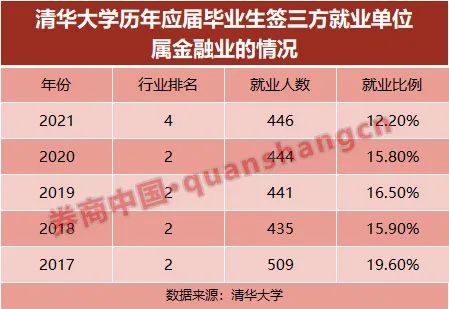 根据券商中国记者对近年来清华大学签三方就业数据进行统计,“金融业”就业比例一直以来排名第2。其中,在2017年清华大学有509人去往金融业就业,占比接近20%。