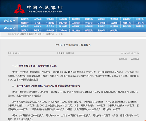 央行7月9日公布的上半年金融数据显示,6月新增人民币贷款2.12万亿元,社融增量3.67万亿元,均超市场预期。受信贷投放强劲以及由此带来的货币派生能力增强,6月末,广义货币(M2)同比增长8.6%,增速比上月末高0.3个百分点。