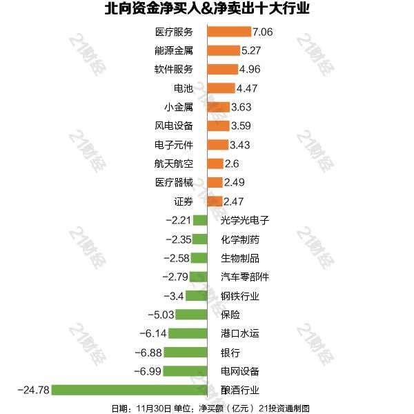 从净买入金额来看,北向资金增持了32个行业,其中医疗服务居首,净买入金额达7.06亿元;减持了68个行业,其中酿酒行业最多,净卖出金额达24.78亿元。