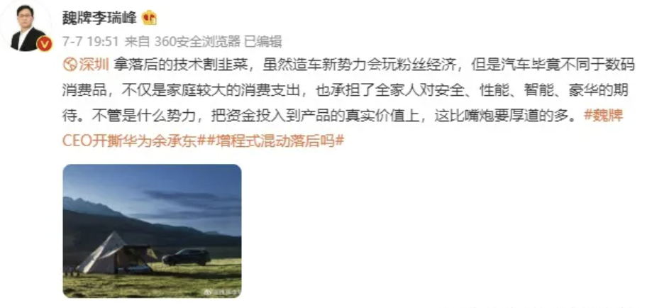 “魏派CEO手撕华为余承东”也如愿成为新浪热搜,可是魏派代言人是华为二公主姚安娜,同样是“碰瓷营销”,长城与魏派的碰瓷就显得“没品位”。