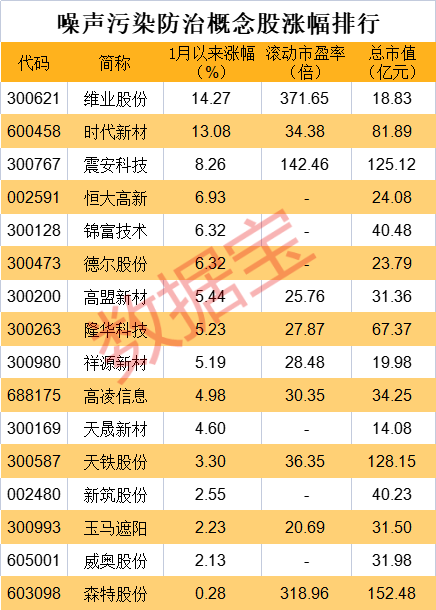 数据宝统计,节后噪声污染防治概念股普涨,维业股份、时代新材等涨幅超过10%。