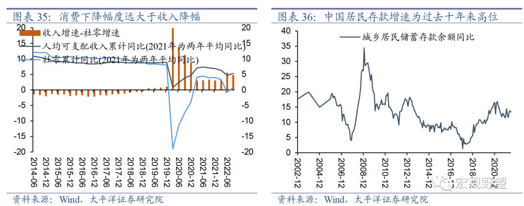从外需转向内需是2023年中国经济的大趋势。全球经济正处于下行趋势之中,甚至存在很大的衰退风险,目前来看几乎没有任何力量能够改变这一趋势。所以出口下行是较为确定的趋势。中国出口对就业的拉动力较强,2020-2022年中国出口的高速增长是政策较有“定力”的底气所在。而近期出口快速走弱则凸显了政策加码刺激内需的必要性。我们认为消费大概率逐级上行,是经济的主要拉动力。2020年疫情之后,中国经济的一大特征是消费增速下降的幅度远大于GDP及居民收入的下行幅度。通常情况下,由于居民的边际消费倾向小于1,所以消费的波动幅度会低于收入的波动幅度,而疫情后的实际情况违背了这一规律。我们认为主要是两个原因,一是很多地区大规模的封城抗疫导致消费场景消失,居民无法消费;二是疫情防控政策的不确定性导致居民收入预期不稳定,消费意愿大幅下滑,预防性储蓄上升。这两个原因归根结底都在于疫情的影响,其结果是疫情后居民消费的波动率较收入更大。随着疫情防控政策的解除,居民的消费场景和消费意愿将会得到较大规模的释放。同时,预防性储蓄的大幅上升使得近三年来居民存款增速为过去十年来的高位,这是2023年消费复苏的潜在动力。此外,促进消费是今年政策上扩大内需的重中之重,可以预计此前很多刺激消费的政策可能会在2023年得到延续,并有较多的新的政策想象空间,助力居民消费的复苏。其中,可选消费可修复的空间大于必选消费,房地产后周期类消费的复苏可能会较为滞后。