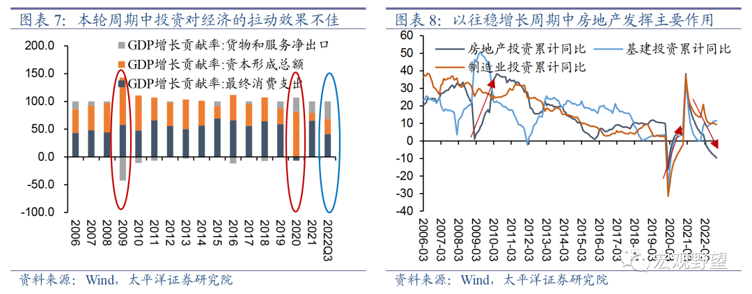 其次,本轮“稳增长”政策的侧重点有所变化。中国历来“稳增长”的核心都是稳投资,所以可以看到典型的“稳增长”年份比如2009年和2020年,投资对经济的贡献率均有非常显著的上升。而2022年“稳增长”周期中投资对经济的贡献率却没有明显上升,反映出政策对经济的拉动力不足。究其原因,我们认为是政策发力点的变化。以往“稳增长”周期中,通常政策放松力度最强的领域在于房地产,其次是基建及制造业,所以房地产行业回暖速度较快。而本轮周期中,房地产相关政策始终较为犹豫,直到四季度才明显发力,房地产投资也持续下滑。而政策的主要支持方向为制造业,其次是基建。这一转变是经济结构优化的标志,但对于整体经济的拉动乘数而言,房地产投资>基建投资>制造业投资。所以新的思路之下,政策对于经济的乘数效果是降低的,也就意味着要达到和以往周期中相同的效果,当前政策所需的力度更大。