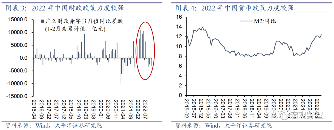 3.3. 政策预计前松后紧我们认为2023年政策的节奏可能是“前松后紧”。“前松”是较为确定性的趋势。从经济基本面上来看,目前中国正在受到出口快速下滑和第一波疫情的双重冲击,内需亟待接棒外需来稳定经济增速,客观上需要政策继续发力来支持经济。从政策导向上来看,中央经济工作会议指出“继续实施积极的财政政策和稳健的货币政策,加大宏观政策调控力度”,主观上奠定了未来一段时间内宏观政策继续加码的基调。所以我们认为上半年宏观政策仍将保持宽松。“后紧”有一定不确定性。如果一季度的疫情冲击过后,二季度经济恢复状况较好,则政策有可能会在年中左右转向。如果经济复苏持续发力则政策宽松时间会相应延长。回顾近年来施政节奏可以看出,中国政策制定者对于宽松的力度还是较为谨慎的。比如2018年年末确立了“稳增长”的基调,但在2019年一季度经济复苏超预期之后,政策很快在4月份的政治局会议中边际收紧。2020年一季度受到了首轮疫情的冲击,但在二季度经济复苏之后,三季度就提出“三道红线”,国常会“预告”的降准也未落地,政策边际转向收紧。可见在经济趋势出现较为明确的向好趋势之后,政策导向的变化可能会较快发生。中央经济工作会议中重新提出“广义货币供应量和社会融资规模增速同名义经济增速基本匹配”,在2022年经济向下、货币供给增速向上的格局下,二者显然是不匹配的,货币超发较多。所以2023年货币供给增速将整体上向下回归。总而言之,如果二季度中国经济能够出现较好的复苏趋势,则年中可能是政策转向的时点。