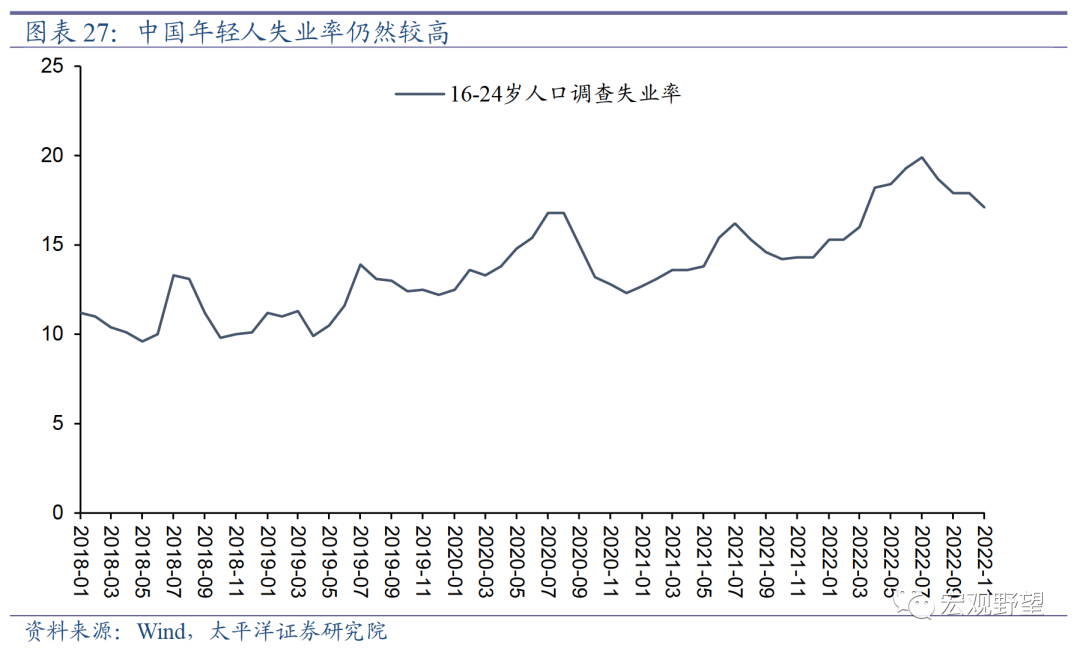 同时,与西方国家疫情后持续紧张的劳动力市场不同,中国在疫情之中所受到的是通缩性冲击,所以失业率持续走高,尤其是年轻人的失业率在2022年中已经达到接近20%的水平,现在也处于历史高位。较为严重的失业问题意味着社会上有大量的闲散劳动力还未使用,而这将在很大程度上对冲疫情导致的劳动力供给不足。