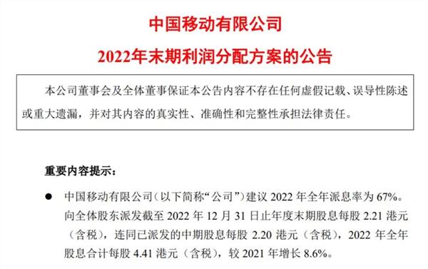 根据公告,中国移动此前已派发中期股息每股2.20港元(含税),本次将派发末期股息每股2.21港元(含税),全年股息合计每股4.41港元(含税),较2021年增长8.6%。
