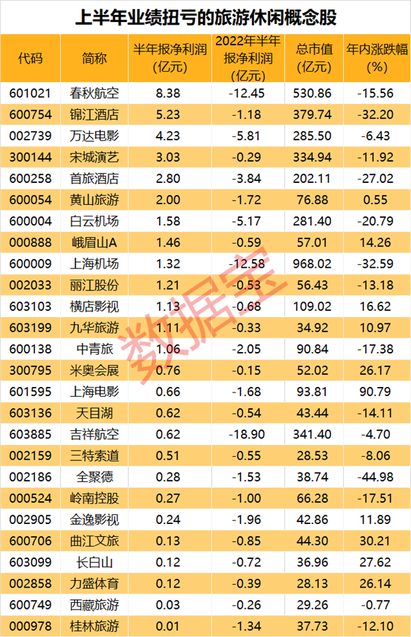 证券时报·数据宝统计,A股中,49股涉及旅游出行、休闲消费概念,其中上半年实现盈利的有36股;26股上半年业绩同比由亏转盈,占比超五成。