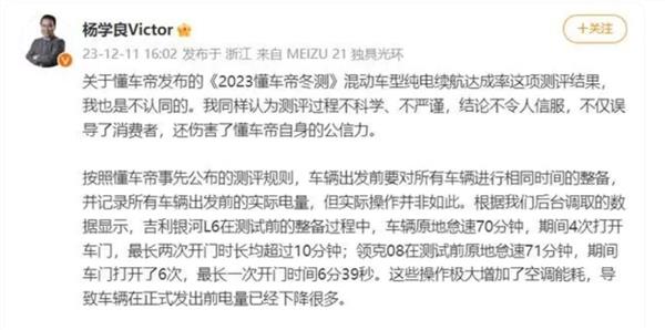 11日下午,吉利集团副总裁杨学良也发文回应懂车帝冬测。“关于懂车帝发布的《2023懂车帝冬测》混动车型纯电续航达成率这项测评结果,我也是不认同的。我同样认为测评过程不科学、不严谨,结论不令人信服,不仅误导了消费者,还伤害了懂车帝自身的公信力。”