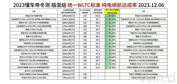 其中,严寒情况下的混动车型纯电续航达成率,约20个车型参加测试。其中,比亚迪仰望以85.08%的续航达成率排名第一,华为、赛力斯联合打造的问界M7增程版倒数第一,只有31.6%。此外,吉利、长城旗下的多款车型在测试中续航达成率均不到40%。