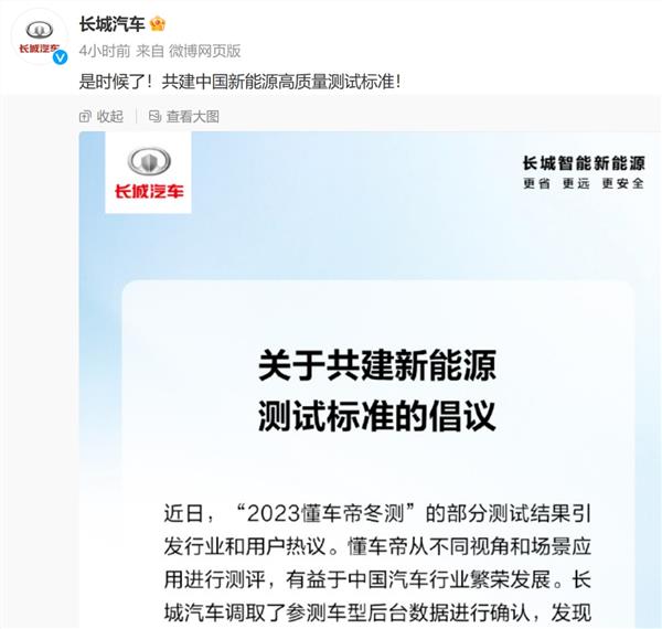 长城汽车称,呼吁并将全力推动中国汽车行业监管机构、车企、测评机构、媒体和用户共同协力,制定更加贴合用户实际应用场景、实际环境条件、实际工况条件的新能源测试标准。