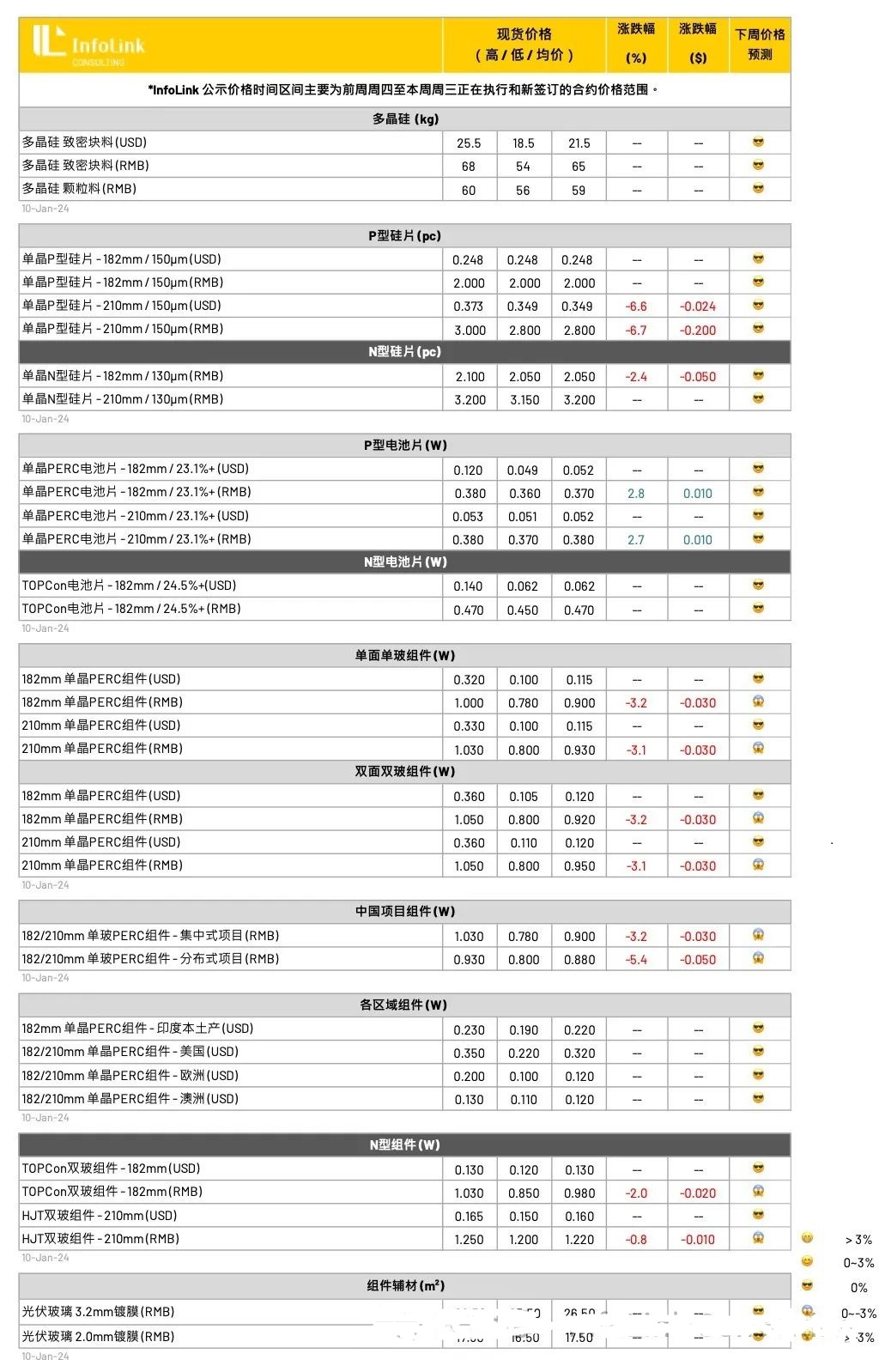 本周价格仍受厂家调价影响走低,本周均价PERC调整至0.9元人民币、TOPCon也开始跌破1元人民币大关。