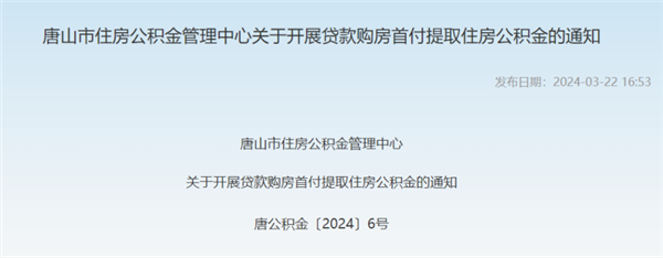 3月22日,唐山市住房公积金管理中心发布《关于开展贷款购房首付提取住房公积金的通知》。