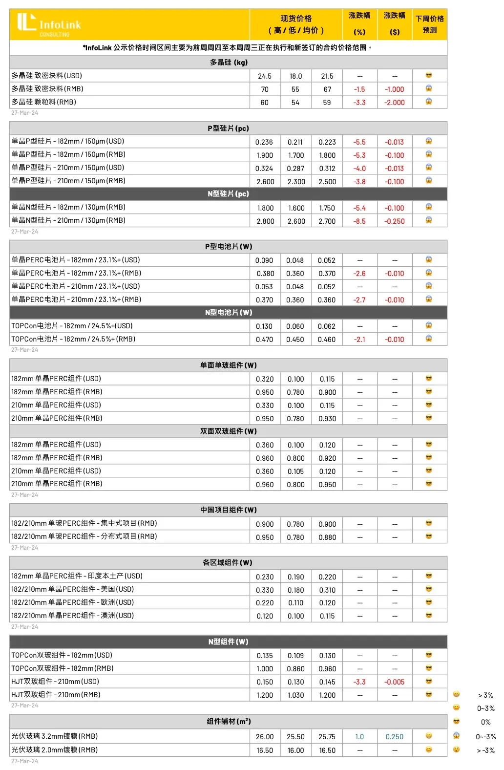 时序来到三月底,组件价格整体维稳,高低价格区间因订单执行前后调价、整体价格落差仍较大,目前观察182PERC双玻组件价格区间约每瓦0.8-0.95元人民币;TOPCon组件价格区间约在每瓦0.85-1元人民币仍有执行,其中区分集中式项目与分布式项目价格观察落差确实较明显,集中式项目价格执行以每瓦0.86-0.93元人民币(剔除非当前执行价格),甚至前期订单签订本周仍有执行每瓦1元左右人民币的价位,而分布式项目则主要在每瓦0.93-0.95元人民币的水平,也有部分低价资源订单;HJT组件价格区间约在每瓦1.03-1.2元人民币之间,海外价格近期有部分新签单执行,价格略有变动至每瓦0.13-0.15元美金的水平。