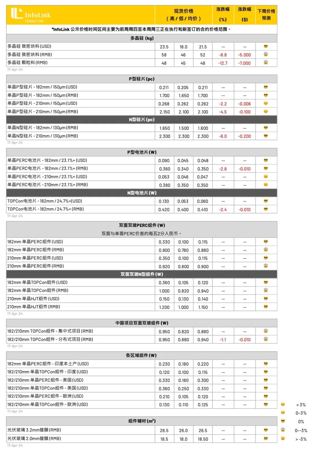 近两周以来,国内项目交付主要依靠集中式项目交付为主,较少新项目走单,也因此四月以来价格偏向集中式项目交付价位执行,目前调价项目交付执行确实有无法执行的状况。供应链中上游价格下探博弈,情绪也蔓延至组件环节,使得组件探涨更加不易,然一线厂家仍坚守0.88元人民币的底线交付水平,中后段仍有低于成本线的交付价格,后续仍需观察厂家策略而定。