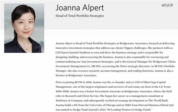 据路透社报道,桥水基金联席首席投资官Karen Karniol-Tambour在内部信宣布——Joanna Alpert(孙悦)正式担任总投资组合策略主管,负责管理桥水最新成立的“Total Portfolio Strategies”部门。