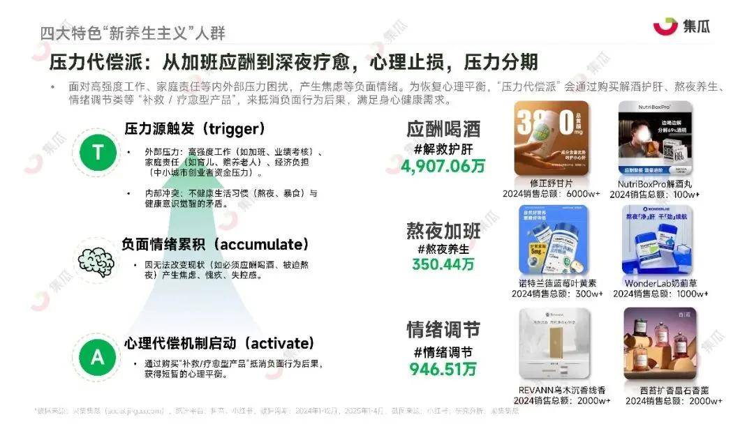 养生行为:负面压力累积后,通过购买解酒护肝产品、熬夜养生方案、情绪疗愈品进行代偿。例如,应酬后购入解酒产品、熬夜后补充“熬夜养生”方案。