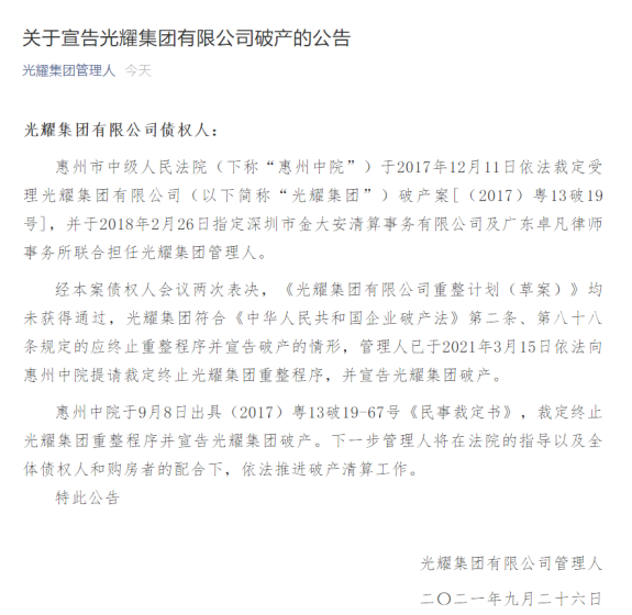 9月26日,光耀集团管理人正式宣布光耀集团有限公司(下称“光耀集团”)破产。