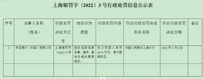 罚单显示,东亚银行主要违法违规事实(案由)为违反信用信息采集、提供、查询及相关管理规定。对于上述违法违规行为,中国人民银行上海分行对东亚银行处以罚款人民币1674万元,责令限期改正。
