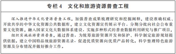 深入推进中华文化资源普查工程,协同推进旅游资源普查工作。加强石窟寺保护展示,推进大遗址保护利用和国家考古遗址公园建设,合理配套旅游服务功能。推动革命文物集中连片保护利用和党史文物保护展示,提升重大事件遗迹、重要会议遗址、重要机构旧址、重要人物旧居保护展示水平。推动有条件的文博单位增强旅游服务功能,提高展陈水平。依托非遗馆、非遗传承体验中心(所、点)、非遗工坊等场所培育一批非遗旅游体验基地,推动非遗有机融入旅游产品和线路,实现更好传承传播。对代表社会主义建设成就重大工程项目进行合理旅游开发,深入挖掘其中蕴含的精神内涵。创新“四个共同”的中华民族历史观在旅游景区景点展陈方式,向游客讲好中华民族共同体故事。