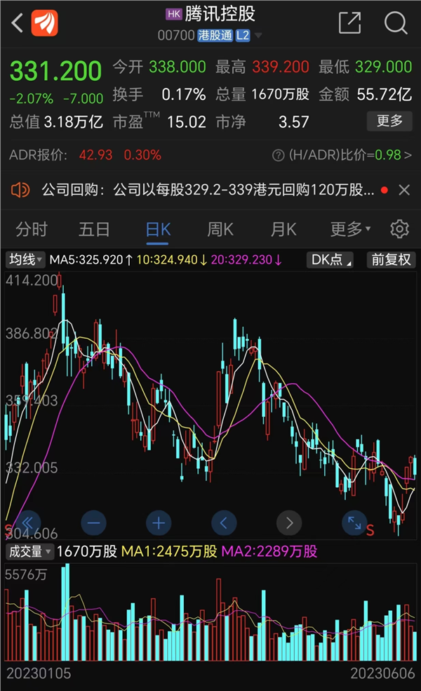 6月6日,腾讯再次打出了4.01亿港元,回购120万股股份,每股成交价介于329.2港元至339港元。截至6月6日收盘,腾讯报收331.2港元/股,下跌2.07%,总市值3.18万亿港元。