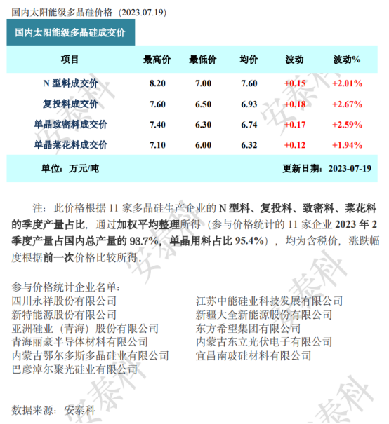 硅料环节前期积压的现货库存,近期去库效果显着,发生大幅下降,有效改善硅料供应端的压力。另外,当月新增产量部分,包括头部厂家在内均有各自特殊情况,月产量环比下修。叠加前期部分买家的囤货策略,以及拉晶环节用料的刚性需求量环比增加,整体稼动水平回升,以及新拉晶产能的释放和炉台增量需求,综合环境变化,引起硅料销售环境发生较大逆转。