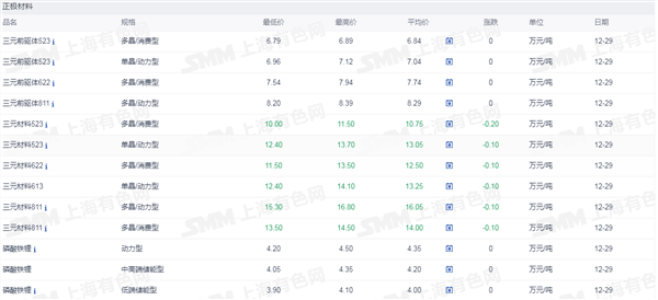 证券之星新能源车行业周报:据上海有色网,截止12月29日,电池级碳酸锂9.3-10.08万元/吨,均价9.69万元/吨,环比上一工作日下滑0.01万元/吨;工业级碳酸锂8.55-9.05万元/吨,均价8.80万元/吨,环比上一工作日持平。临近年末,市场成交依旧维持清淡局面。当前贸易商因近期期现货价差扩大,进行持续期现货套利,对锂盐端采买需求小幅增加,而部分盐厂在期货价格相对较高的情况下,交仓意愿亦有所增强,供应端挺价情绪渐浓,市场维持弱稳局面。