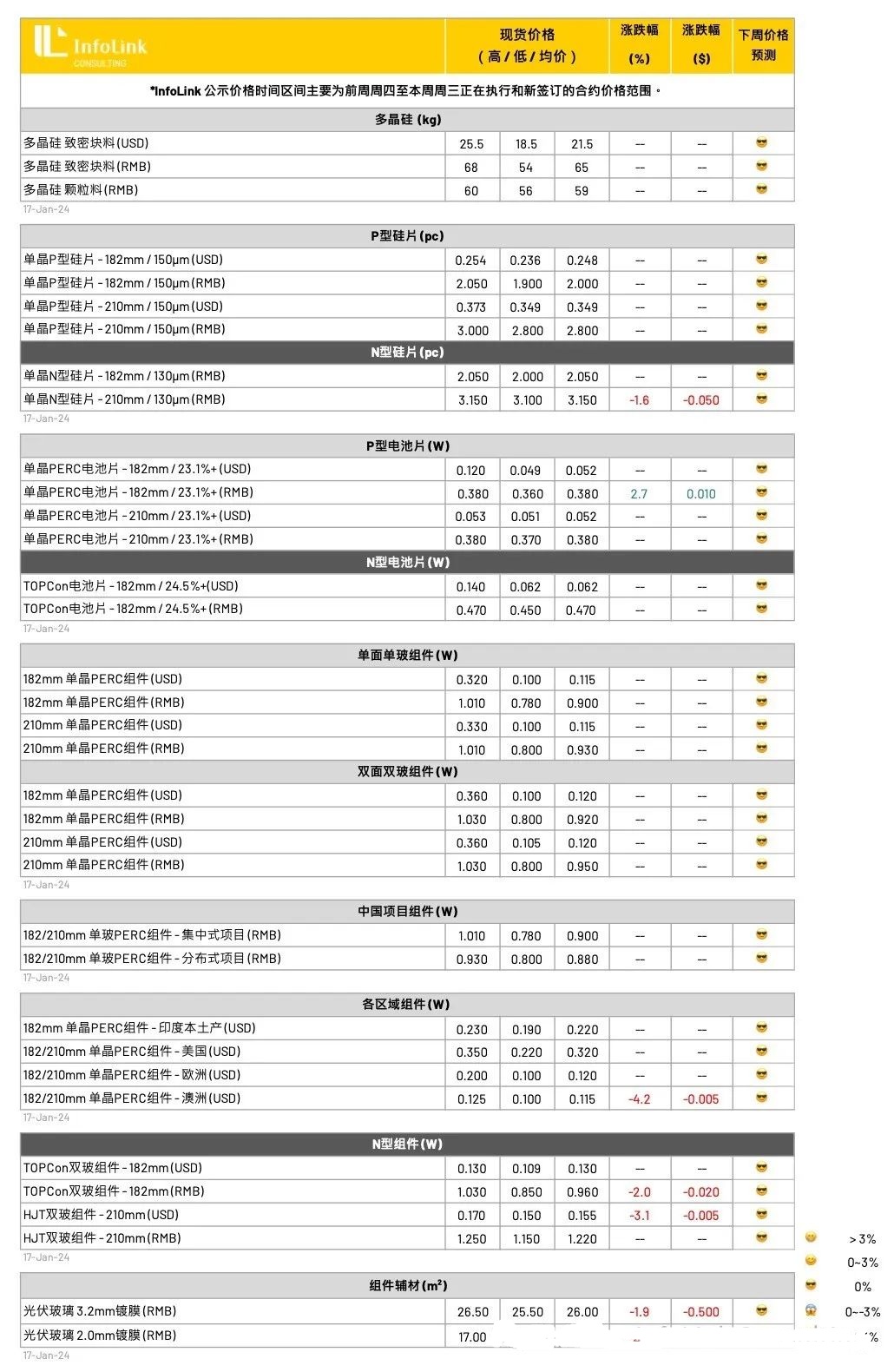 HJT价格因成本因素、且市场尚未明显打开,价格也受前单签订执行价格较高,与新单分化明显,目前国内价格约每瓦1.15-1.25元人民币之间,海外订单价格僵持在每瓦0.150-0.170元美金。