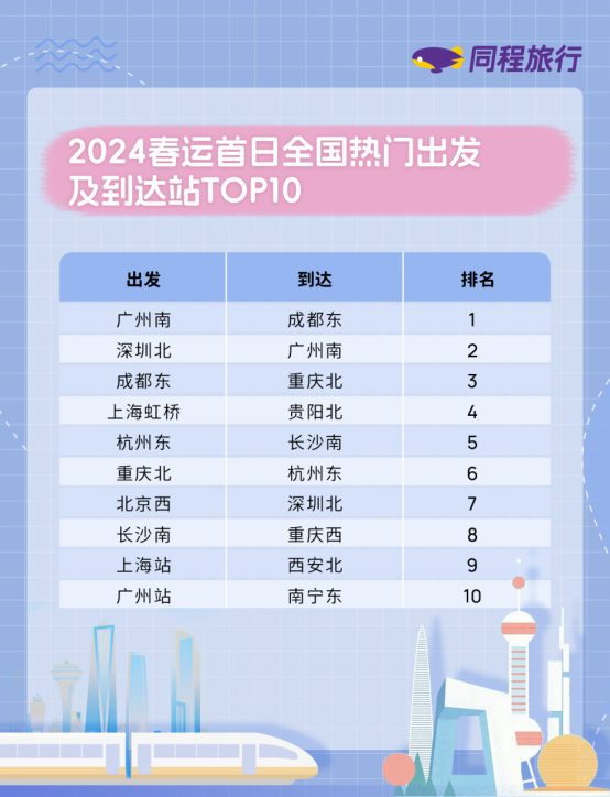 1月26日,2024年春运正式启动。同程旅行平台数据显示,春运第一天全国出发客流量较大的铁路站点主要有:广州南、深圳北、成都东、上海虹桥、杭州东、重庆北、北京西、长沙南、上海站、广州站等。1月26日当天到达客流量较大的铁路站点主要有:成都东、广州南、重庆北、贵阳北、长沙南、杭州东、深圳北、重庆西、西安北、南宁东等。
