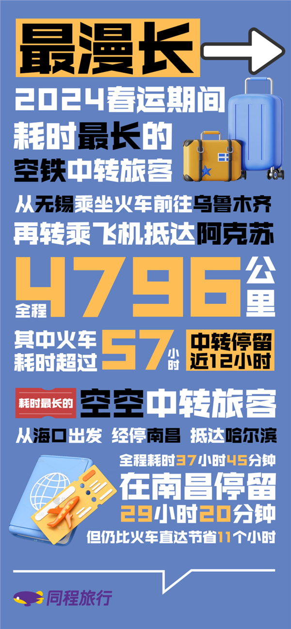 最漫长的旅途也是前往新疆。同程旅行平台上,一位旅行者从无锡乘坐火车前往乌鲁木齐,再转乘飞机抵达阿克苏,全程4796公里,耗时70小时10分钟,总共需要3天时间才能抵达目的地。其中火车耗时超过57小时,中转停留近12小时,是春运期间行程耗时最长的空铁联运旅客。国内旅途时间最长的空空中转旅客从海口出发,经停南昌,抵达哈尔滨,全程耗时37小时45分钟,其中在南昌停留29小时20分钟,但仍比火车直达节省11小时,还可以在路上品尝一下南昌米粉。