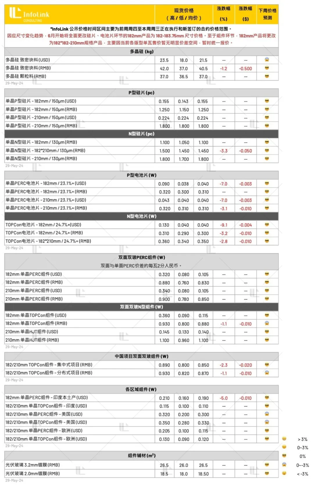 五月底供应链价格触底,项目观望情绪持续增加,厂家多数观望六月开标项目,目前国内需求也较疲弱,海外需求平淡、欧洲需求疲软,组件库存攀升,初步调查组件排产,一线厂家反馈暂时维持五月排产,部分海外厂区则受到政策波动影响、稼动率仍出现下降趋势。