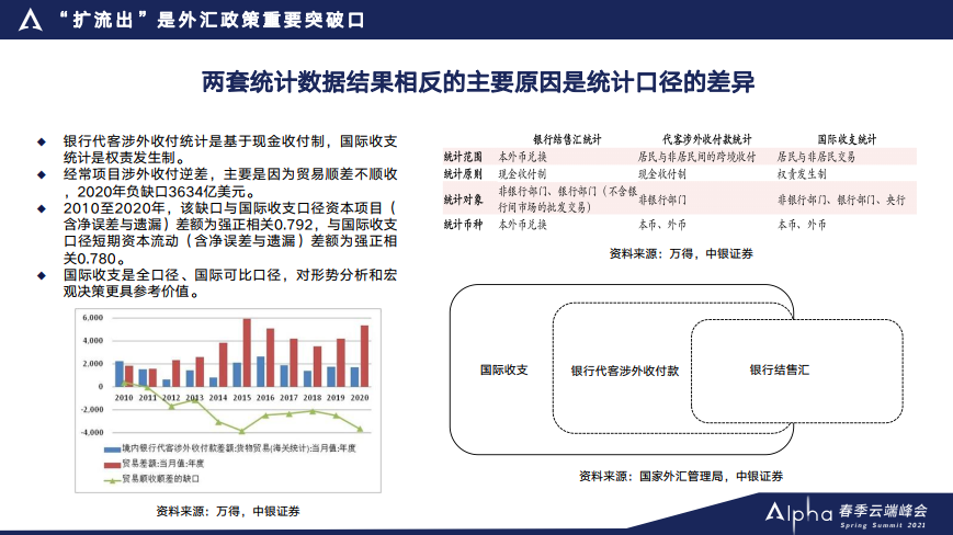 为什么我们从两套数据对人民币升值压力的判断会得出不同的判断?很重要的原因是这两套数据的统计口径不一样。银行代客跨境收付的统计或者涉外收付的统计,是基于现金收付制,在银行办理业务的时候有现金收入或者支出,那么银行在办理业务的时候就会采集数据,这是国际收支数据统计的一个重要来源。