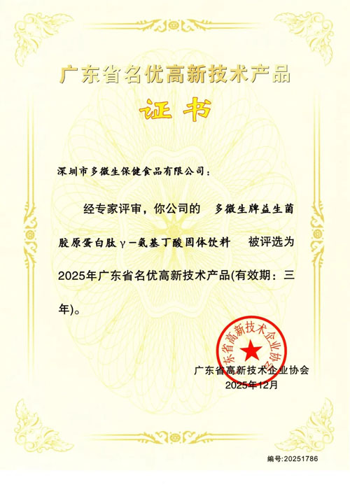 ●绿之韵数字化益生菌胶原蛋白肽γ-氨基丁酸固体饮料获评“广东省名优高新技术产品”