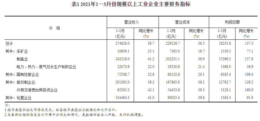 1—3月份,全国规模以上工业企业实现利润总额18253.8亿元,同比增长1.37倍(按可比口径计算,详见附注二),比2019年1—3月份增长50.2%,两年平均增长22.6%。
