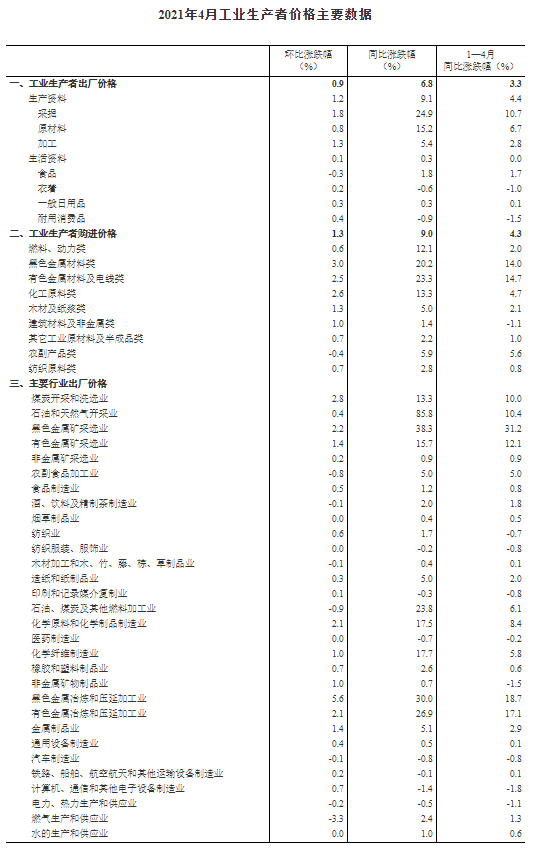 (原标题:中国4月CPI同比涨0.9%,PPI涨幅扩大至6.8%,大宗商品涨价影响明显)