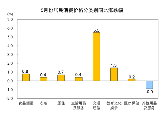 其他七大类价格同比六涨一降。其中,交通通信、教育文化娱乐、居住价格分别上涨5.5%、1.5%和0.7%,衣着、生活用品及服务、医疗保健价格分别上涨0.4%、0.4%和0.2%;其他用品及服务价格下降0.9%。