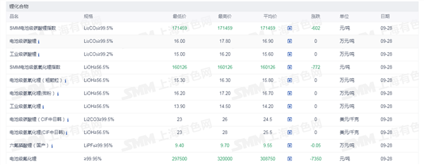 证券之星新能源车行业周报:据上海有色网,截止9月28日,电池级碳酸锂16-17.8万元/吨,均价16.9万元/吨,环比上一工作日持平;工业级碳酸锂15-16.2万元/吨,均价15.6万元/吨,环比上一工作日持平。今日已是国庆小长假前的前夕,下游多数厂家已于前期完成节前小幅补库,当前市场总体成交依旧偏淡。
