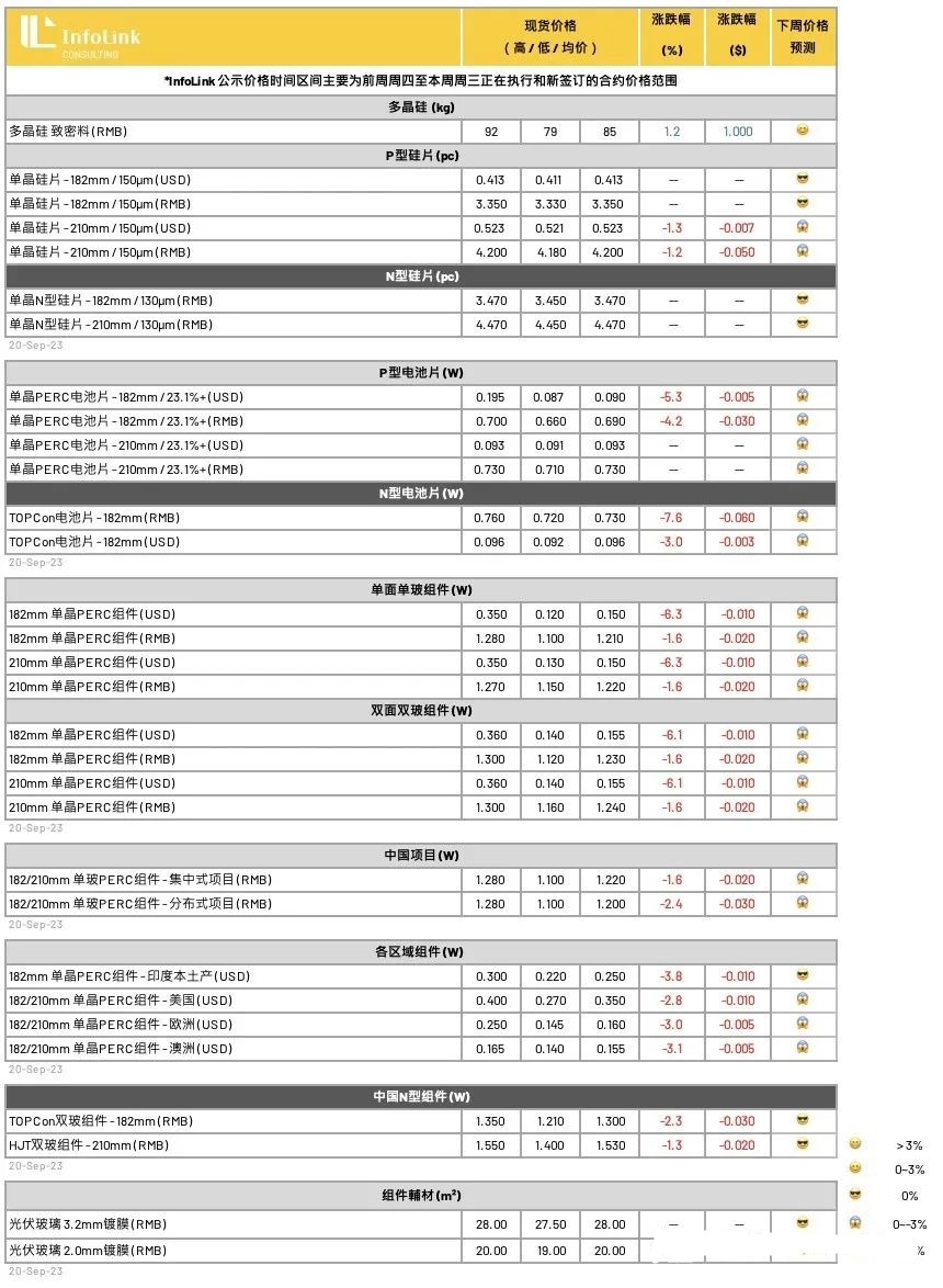 随着厂家TOPCon产能陆续投产爬坡,低效与测试片在市场上充斥泛滥,成交价格持续探低,也连带引导主流档位电池价格受影响下跌,同时,在组件端压力传导下,本周电池环节价格逐渐崩塌,并牵连其上下游价格也同步松动。