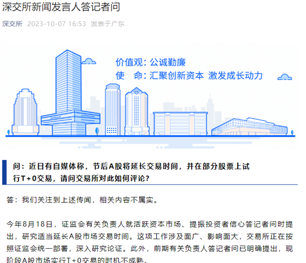 答:我们关注到了上述传闻,相关内容不属实。今年8月18日,证监会有关负责人就活跃资本市场、提振投资者信心答记者问时提出,研究适当延长A股市场交易时间。这项工作涉及面广、影响面大,交易所正在按照证监会统一部署,深入研究论证。此外,前期有关负责人答记者问已明确提出,现阶段A股市场实行T+0交易的时机不成熟。