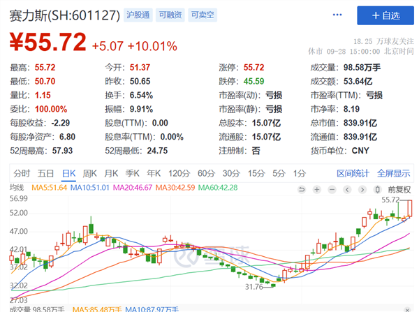 另外,假期前,问界“代工厂”赛力斯股价节节攀升。