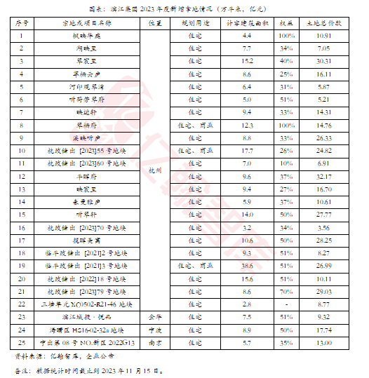 2023年滨江集团在投资拿地上,可谓是好运加持,上半年在杭州集中供地中报名参拍+摇号地块数有12宗,最终拿到11宗,成为杭州土拍市场上的最大赢家,同样不禁投来艳羡的目光,毕竟核心城市的地块拿一块少一块,而且从算账的角度说,企业拿到的地盈利空间是可见的。至11月中旬,滨江集团通过公开招拍挂和并购共计拿地20余宗,均位于长三角区域,如杭州、金华、宁波、南京,大本营杭州拿地宗数占比超过九成。