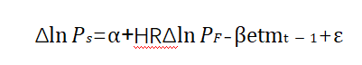 3、误差修正模型(ECM)VAR模型虽然解决了回归模型中的残差序列相关问题,但它并没有考虑现货和期货价格可能存在的协整关系。ECM模型不仅解决了OLLS回归可能存在的残差自相关问题,而且考虑了现货价格和期货价格的非平稳性,长期均衡关系和短期动态关系,即协整关系: